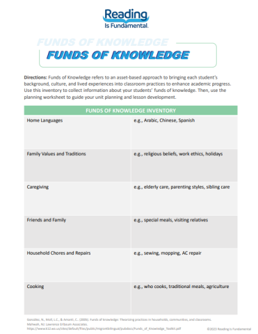 Funds of Knowledge refers to an asset-based approach to bringing each student’s background, culture, and lived experiences into classroom practices to enhance academic progress. Use this inventory to collect information about your students’ funds of knowledge. Then, use the planning worksheet to guide your unit planning and lesson development.